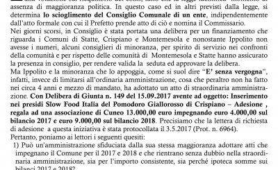 Riceviamo e pubblichiamo E’ noto che l’Amministrazione Ippolito il 31 agosto 2017 è andata in minoranza alla votazione sul riequilibrio dei conti, fatto che la legge identifica momento di assenza di maggioranza politica. In questo caso ed in altri previsti dalla legge, si determina lo scioglimento del Consiglio Comunale di…