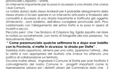 Riceviamo e Pubblichiamo Il circolo PD di Crispiano ringrazia il consigliere provinciale PD Sig. Franco Andrioli – Sindaco di Statte – per aver ottenuto dalla Provincia i lavori per il rifacimento del manto stradale della strada provinciale Crispiano – Statte. Un intervento importante per la posa in sicurezza si una…