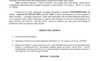 LINK SITO COMUNE DI CRISPIANO http://www.comune.crispiano.ta.it/images/doc00924820200528150203.pdf Convocazione Consiglio Comunale, in sessione STRAORDINARIA, da tenersi il giorno 04 GIUGNO 2020, alle ore 15:00, in prima convocazione, da tenersi presso la Sala Consiliare ” Giuseppe Giacovazzi ” della sede Municipale sita in Piazza Madonna della Neve, con la garanzia delle misure finalizzate…