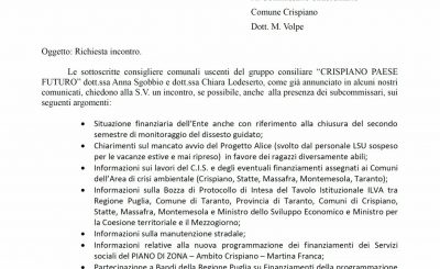 Articolo dalla pagina Facebook di Paese Futuro Crispiano PER IL 2 FEBBRAIO È PROGRAMMATO UN INCONTRO CON IL COMMISSARIO STRAORDINARIO RICHIESTO DA ANNA SGOBBIO E CHIARA LODESERTO Con la lettera del 12 gennaio scorso, che qui alleghiamo, le consigliere comunali uscenti Anna SGOBBIO, già capogruppo, e Chiara LODESERTO hanno richiesto…