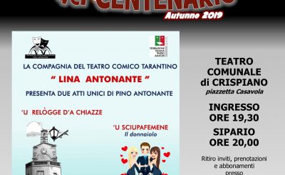 La Rassegna di Teatro della “Compagnia del Velario” dedicata al centenario presegue con una compagnia tarantina. Domenica 17 novembre infatti sarà la volta della Compagnia del Teatro comico LINA ANTONANTE che presenterà due atti unici scritti e diretti da Pino Antonante: “U relogge d’a chiazze” e “U sciupafemmene”. L’ingresso al…