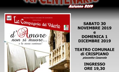 L’Associazione Teatrale COMPAGNIA DEL VELARIO di Crispiano, promotrice della rassegna dedicata al Centenario dell’Autonomia del paese delle cento masserie, presterà sabato 30 novembre e domenica 1 dicembre, la sua commedia “D’Amore non si muore… ma la storia continua”. Si tratta di due atti brillanti scritti da Michele Vinci e Luciano…