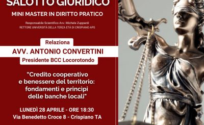 L’ Avvocato Antonio Convertini, Presidente della Banca di Credito Cooperativo di Locorotondo, sarà ospite del nostro Salotto Giuridico per la prima lectio magistralis del Mini Master in Diritto Pratico.Un enorme vanto per l’Università della Terza Età di Crispiano, una irrinunciabile opportunità per la nostra comunità.Appuntamento a lunedì 28 aprile, ore…