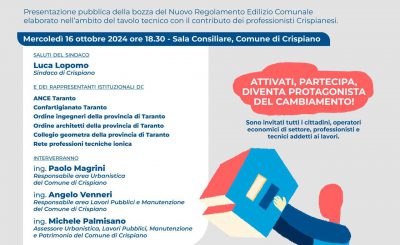 Il Comune di Crispiano invita tutti i cittadini, i tecnici e gli operatori del settore a partecipare alla presentazione della bozza del Nuovo Regolamento Edilizio Comunale, che si terrà mercoledì 16 ottobre alle ore 18:30 presso la sala consiliare. Questo importante documento rappresenta un passo fondamentale per lo sviluppo sostenibile…