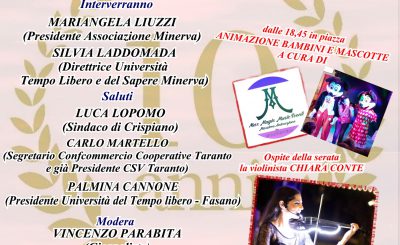 La nostra Associazione e la nostra Università del Tempo Libero e del Sapere, festeggia il traguardo dei 10 anni dalla sua fondazione (atto costitutivo firmato a Luglio del 2014) e lo faremo in maniera festosa e coinvolgente Ecco il programma dell’evento:Dalle 17,00 sala consiliare del Comune di Crispiano:Interventi di:* Mariangela…