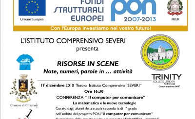 L’ISTITUTO COMPRENSIVO “F. SEVERI” presenta “NATALE 2010” 22 Novembre2010 ore 10,00 presso il salone scuola Giovanni XXIII“7^ PETTOLATA DELLA SOLIDARIETA”pro ANT e MISERICORDIA di CRISPIANO 12 Dicembre 2010 ore 16,00 presso la sala teatro della scuola MEDIA- PREMIAZIONE —3^ed. Concorso di Poesia “Poetando…in allegria” in collaborazione con la Biblioteca “C.NATALE”…