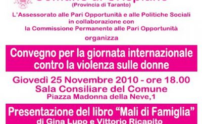 Giovedì 25 Novembre 2010 alle ore 18.00 presso la sala consiliare del comune di Crispiano si terrà un convegno sulla giornata internazionale contro la violenza sulle donne. Interverranno il sindaco dott. Giuseppe Laddomada, il presidente del consiglio comunale sig. Giuseppe Bennardi, l’avv. Gina Lupo, la prof. Anna Sturino dirigente scolastico…