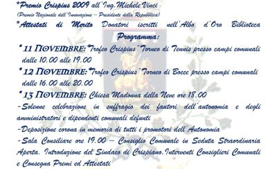 Quest’anno ricorre il 90° Anniversario dell’Autonomia Comunale, riconosciuta con Decreto n. 2403 del 14/11/1919 di Vittorio Emanuele III, per Grazia di Dio e per volontà della Nazione, Re d’Italia. La Giunta Comunale di Crispiano, con atto n. 257 del 05.11.2009 ha indetto le celebrazioni per ricordare tutti i promotori dell’Autonomia…